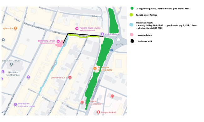 On the Mäsiarska street is paid parking on working days: Monday-Friday 8:00 – 16:00 (1,- €/ 1 hour). all other times is PARKING FOR FREE (that means during weekends too).