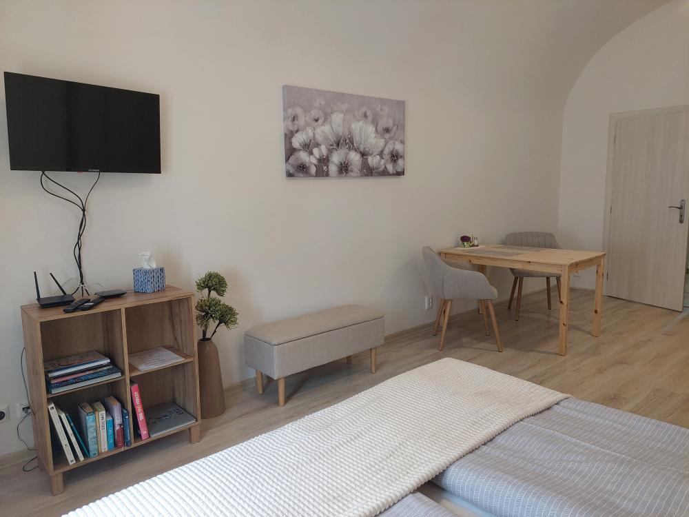 These apartments are located on the 1st floor directly on the loggia of a historic house from the 15th century. The apartment, with an area of 29 square meters, provides comfortable accommodation for two people. The bathroom with a shower and toilet is part of the apartment. Towels and a hairdryer are available. In the main room, there is a