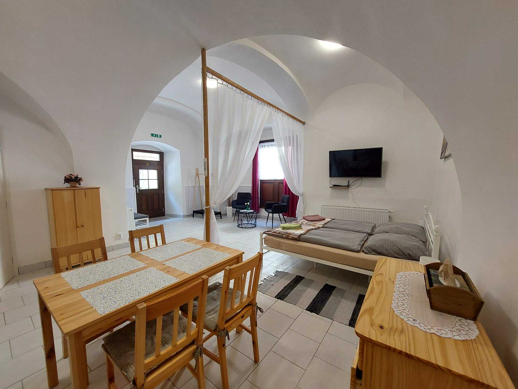 This spacious apartment with an area of 55 m2 is located on the ground floor and consists of 2 rooms. In front of the apartment, you have seating available where you can enjoy the beautiful garden with morning coffee or evening relaxation with a glass of wine. In the hot summer months, its meter-wide walls create natural air conditioning :) In the main room, there is a double bed with a canopy. Right next to it is a kitchenette with a refrigerator, stove, and dining table. For preparing simple meals, there are plates, cutlery, glasses, and pots. Thanks to the kettle, coffee, and tea, you can prepare a cup of hot drink at any time. The apartment also includes a TV, wireless internet, cards, and books, ensuring pleasant relaxation after a day trip in Slovak Paradise or a tour of historical Levoča. The bathroom with a shower, toilet, and washing machine is part of the apartment. Towels and a hairdryer are available. In the second room, you will find 2 beds and storage space. The apartment is centrally heated and non-smoking, which ensures a pleasant environment for all guests.
